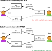 Multipath TCP is particularly useful in the context of wireless networks;[2] using both Wi-Fi and a mobile network is a typical use case.[3] In addition to the gains in throughput from inverse multiplexing, links may be added or dropped as the user moves in or out of coverage without disrupting the end-to-end TCP connection.[4]