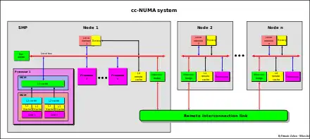 A cc–NUMA system is a cluster of SMP systems – each called a "node", which can have a single processor, a multi-core processor, or a mix of the two, of one or other kinds of architecture – connected via a high-speed "connection network" that can be a "link" that can be a single or double-reverse ring, or multi-ring, point-to-point connections,[6][7] or a mix of these (e.g. IBM Power Systems[6][8]), bus interconnection (e.g. NUMAq[9]), "crossbar", "segmented bus" (NUMA Bull HN ISI ex Honeywell,[10]) "mesh router", etc.