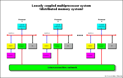 In loosely-coupled multiprocessor systems, each processor has its own local memory, input/output (I/O) channels, and operating system. Processors exchange data over a high-speed communication network by sending messages via a technique known as "message passing". Loosely-coupled multiprocessor systems are also known as distributed-memory systems, as the processors do not share physical memory and have individual I/O channels.