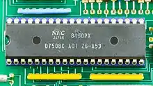 The μCOM-80 (μPD8080A) is an 8-bit microprocessor that is pin-compatible with the Intel 8080 and software-compatible with the μCOM-8. That is, the μPD8080A has some improvements compared to the Intel 8080:[5]:150