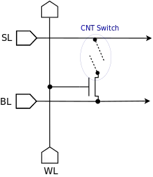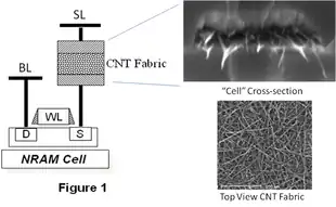 NRAMs are fabricated by depositing a uniform layer of CNTs onto a prefabricated array of drivers such as transistors as shown in Figure 1. The bottom electrode of the NRAM cell is in contact with the underlying via (electronics) connecting the cell to the driver. The bottom electrode may be fabricated as part of the underlying via or it may be fabricated simultaneously with the NRAM cell, when the cell is photolithographically defined and etched. Before the cell is photolithographically defined and etched, the top electrode is deposited as a metal film onto the CNT layer so that the top metal electrode is patterned and etched during the definition of the NRAM cell. Following the dielectric passivation and fill of the array, the top metal electrode is exposed by etching back the overlying dielectric using a smoothing process such as chemical-mechanical planarization. With the top electrode exposed, the next level of metal wiring interconnect is fabricated to complete the NRAM array. Figure 3 illustrates one circuit method to select a single cell for writing and reading. Using a cross-grid interconnect arrangement, the NRAM and driver, (the cell), forms a memory array similar to other memory arrays. A single cell can be selected by applying the proper voltages to the word line (WL), bit line (BL), and select lines (SL) without disturbing the other cells in the array. Alternatively between the bottom electrode and top metal layer they may be two layers of CNTs: one with uniformly arranged CNTs, and another with randomly arranged CNTs. The uniformly arranged CNTs are used to protect the randomly arranged CNTs from the top metal layer.[2]