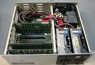 The computer consists of a thick aluminum chassis separated into left and right compartments with a plywood cover which sat on the top and draped over the left and right sides. (It is one of only a handful of computers to be sold in a wooden cabinet. Later versions featured an all-metal case which met safety standards.[5]) The rear section of the compartment on the right held a linear power supply, including a large transformer and power capacitors, comprising much of the bulk and weight of the system. The empty section in front of the power supply normally housed one or two floppy disk drives, placed on their side so the slots were vertical. The compartment on the left held the S-100 motherboard, rotated so the slots ran left-right. Although a few logic circuits were on the motherboard, primarily for I/O functions, both the processor and the memory resided in separate daughterboards.