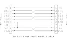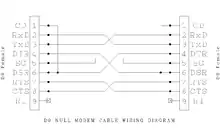 Below is a very common wiring diagram for a null modem cable to interconnect two DTEs (e.g. two PCs) providing full handshaking, which works with software relying on proper assertion of the Data Carrier Detect (DCD) signal:[2]