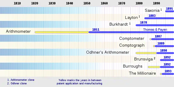 From 1892 to the middle of the 20th century, independent companies were set up all over the world to manufacture Odhner's clones and, by the 1960s, with millions sold,[1] it became one of the most successful type of mechanical calculator ever designed.