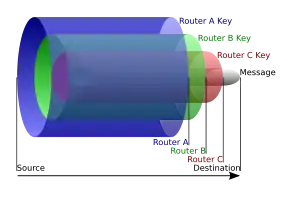 Onion routing is a technique for anonymous communication over a computer network. In an onion network, messages are encapsulated in layers of encryption, analogous to the layers of an onion. The encrypted data is transmitted through a series of network nodes called "onion routers," each of which "peels" away a single layer, revealing the data's next destination. When the final layer is decrypted, the message arrives at its destination. The sender remains anonymous because each intermediary knows only the location of the immediately preceding and following nodes.[1] While onion routing provides a high level of security and anonymity, there are methods to break the anonymity of this technique, such as timing analysis.[2]