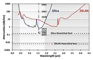 Attenuation in optical fiber is caused primarily by both scattering and absorption. In fibers based on fluoride glasses such as ZBLAN, minimum attenuation is limited by impurity absorption. Vast majority of optical fibers are based on silica glass, where impurity absorption is negligible. In silica fibers attenuation is determined by intrinsic mechanisms: Rayleigh scattering in the glasses through which the light is propagating, and infrared absorption in the same glasses. Absorption in silica increases steeply at wavelengths above 1570 nm. At wavelengths most useful for telecommunications, Rayleigh scattering is the dominant loss mechanism. At 1550 nm attenuation components for a record low loss fiber are given as follows: Rayleigh scattering loss: 0.1200 dB/km, infrared absorption loss: 0.0150 dB/km, impurity absorption loss: 0.0047 dB/km, waveguide imperfection loss: 0.0010 dB/km.
