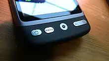 An optical trackpad on a HTC Desire, here, the silver disc in the center of the physical navigation bar of other buttons below the screen