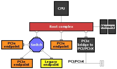 white "junction boxes" represent PCI Express device downstream ports, while the gray ones represent upstream ports.[5]: 7