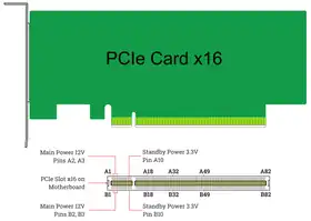 The following table identifies the conductors on each side of the edge connector on a PCI Express card. The solder side of the printed circuit board (PCB) is the A-side, and the component side is the B-side.[21] PRSNT1# and PRSNT2# pins must be slightly shorter than the rest, to ensure that a hot-plugged card is fully inserted. The WAKE# pin uses full voltage to wake the computer, but must be pulled high from the standby power to indicate that the card is wake capable.[22]