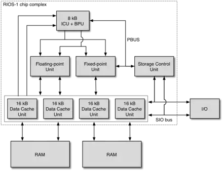 The POWER1 is a multi-chip CPU built from separate chips that are connected to each other by buses. The POWER1 consists of an instruction-cache unit (ICU), a fixed-point unit (FXU), a floating point unit (FPU), a number of data-cache units (DCU), a storage-control unit (SCU) and an I/O unit. Due to its modular design, IBM was able to create two configurations by simply varying the number of DCUs, RIOS-1 and a RIOS.9. The RIOS-1 configuration has four DCUs, the intended amount, and was clocked at up to 40 MHz, whereas the RIOS.9 CPU had two DCUs and was clocked at lower frequencies.