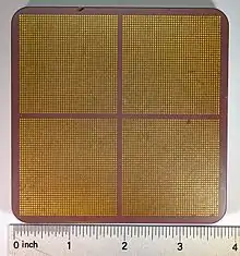 The POWER5 contains 276 million transistors and has an area of 389 mm2. It is fabricated by IBM in a 0.13 μm silicon on insulator (SOI) complementary metal–oxide–semiconductor (CMOS) process with eight layers of copper interconnect. The POWER5 die is packaged in either a dual chip module (DCM) or a multi-chip module (MCM). The DCM contains one POWER5 die and its associated L3 cache die. The MCM contains four POWER5 dies and four L3 cache dies, one for each POWER5 die, and measures 95 mm by 95 mm.[1][2]