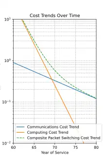 Christopher Strachey, who became Oxford University's first Professor of Computation, filed a patent application in the United Kingdom for time-sharing in February 1959.[18][19] In June that year, he gave a paper "Time Sharing in Large Fast Computers" at the UNESCO Information Processing Conference in Paris where he passed the concept on to J. C. R. Licklider.[20][21] Licklider (along with John McCarthy) was instrumental in the development of time-sharing. After conversations with Licklider about time-sharing with remote computers in 1965,[22][23] Davies independently invented a similar data communication concept to Baran and went on to develop a more advanced design for a hierarchical, high-speed computer network including interface computers and communication protocols.[22][23][24][25][26] He coined the term packet switching, and proposed building a commercial nationwide data network in the UK.[27][28] He gave a talk on the proposal in 1966, after which a person from the Ministry of Defence (MoD) told him about Baran's work.[29] Roger Scantlebury, a member of Davies' team, presented their work (and referenced that of Baran) at the October 1967 Symposium on Operating Systems Principles (SOSP).[25][30][31][32][33] At the conference, Scantlebury proposed packet switching for use in the ARPANET and persuaded Larry Roberts the economics were favorable to message switching.[34][35][36][37][38][39] Davies had chosen some of the same parameters for his original network design as did Baran, such as a packet size of 1024 bits. To deal with packet permutations (due to dynamically updated route preferences) and datagram losses (unavoidable when fast sources send to a slow destinations), he assumed that "all users of the network will provide themselves with some kind of error control",[25] thus inventing what came to be known as the end-to-end principle. Davies proposed that a local-area network should be built at the laboratory to serve the needs of NPL and prove the feasibility of packet switching. After a pilot experiment in early 1969,[40][41][42][43] the NPL Data Communications Network began service in 1970. The NPL team carried out simulation work on datagrams and congestion in networks on a scale to provide data communication across the United Kingdom.[43][44][45][46][47]