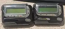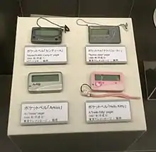 A pager, also known as a beeper or bleeper,[1] is a wireless telecommunications device that receives and displays alphanumeric or voice messages. One-way pagers can only receive messages, while response pagers and two-way pagers can also acknowledge, reply to, and originate messages using an internal transmitter.[2] In Japanese, it was commonly called a pocket bell (ポケットベル, poketto beru) or pokeberu (ポケベル),[3] which is an example of wasei-eigo.