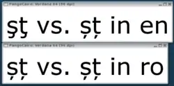 Setting the locale via the POSIX environment variable, e.g. LANG=ro_RO.UTF-8 will also cause Pango to use 'locl' font feature. Finally, you can change the language on the fly in the same text using Pango markup, e.g.: