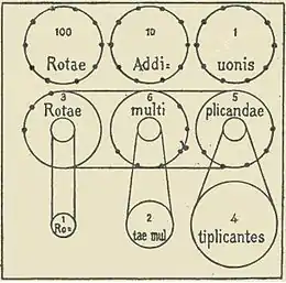 On four of the known machines, above each wheel, a small quotient wheel is mounted on the display bar. These quotient wheels, which are set by the operator, have numbers from 1 to 10 inscribed clockwise on their peripheries (even above a non-decimal wheel). Quotient wheels seem to have been used during a division to memorize the number of times the divisor was subtracted at each given index.[13]