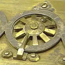 On all the wheels of all the known machines, except for the machine tardive,[9] two adjacent spokes are marked; these marks differ from machine to machine. On the wheel pictured on the right, they are drilled dots, on the surveying machine they are carved; some are just scratches or marks made with a bit of varnish,[10] some were even marked with little pieces of paper.[11]