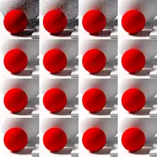 Noise decreases as the number of samples per pixel increase. The top left shows 1 sample per pixel, and doubles from left to right each square.
