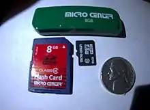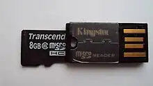 A Kingston card reader which accepts Micro SD memory cards (Transcend card shown partially inserted), and acts as a USB flash drive