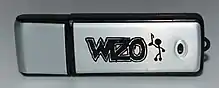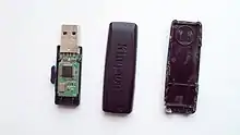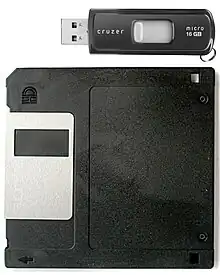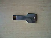 A flash drive (also thumb drive [US], memory stick [UK], and pen drive/pendrive elsewhere)[1][note 1] is a data storage device that includes flash memory with an integrated USB interface. A typical USB drive is removable, rewritable, and smaller than an optical disc, and usually weighs less than 30 g (1 oz). Since first offered for sale in late 2000, the storage capacities of USB drives range from 8 to 256 gigabytes (GB[note 2]), 512 GB and 1 terabyte (TB[note 3]).[4][5] As of 2023, 2 TB flash drives were the largest currently in production.[6][7] Some allow up to 100,000 write/erase cycles, depending on the exact type of memory chip used, and are thought to physically last between 10 and 100 years under normal circumstances (shelf storage time[note 4]).