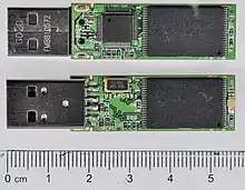 Inside the casing is a small printed circuit board, which has some power circuitry and a small number of surface-mounted integrated circuits (ICs). Typically, one of these ICs provides an interface between the USB connector and the onboard memory, while the other is the flash memory. Drives typically use the USB mass storage device class to communicate with the host.[30]