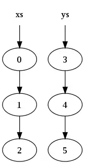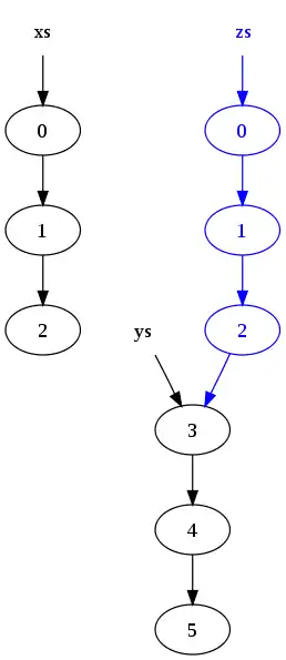 Notice that the nodes in list xs have been copied, but the nodes in ys are shared. As a result, the original lists (xs and ys) persist and have not been modified.