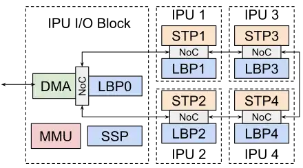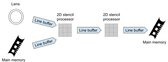 The IPU core has a stencil processor (STP), a line buffer pool (LBP) and a NoC. The STP mainly provides a 2-D SIMD array of processing elements (PEs) able to perform stencil computations, a small neighborhood of pixels. Though it seems similar to systolic array and wavefront computations, the STP has an explicit software controlled data movement. Each PEs features 2x 16-bit arithmetic logic units (ALUs), 1x 16-bit Multiplier–accumulator unit (MAC), 10x 16-bit registers, and 10x 1-bit predicate registers.[2]