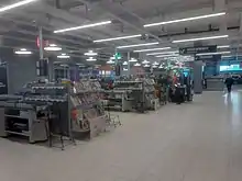 Modern stores have a variety of checkout configurations, but almost all stores will have their main checkout area situated close to the entrance/exits. Smaller stores may utilize simple counters, while big-box stores will typically use a conveyor belt system spaced out in separate "lanes" to process orders. Express lanes might limit the type of payment, or number or type of goods, to expedite service. Some department stores may also have checkouts inside of the departments to allow shoppers of that section to pay without going through the main lines. If each checkout station has a separate queue, customers have to guess which line will move the fastest, to minimize their wait times. They are often frustrated to be wrong or be stuck behind another customer who encounters a problem or who takes excessive time to check out. Some stores use a single, much longer but faster-moving line, that is served by multiple registers, which produces the same average wait time, but reduces the frustration and variance in wait time from person to person.[24] Regardless of the configuration, checkout lines usually pass by impulse buy items to grab the attention of otherwise idle customers.