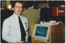 In 1986, Gene Mosher introduced the first graphical point of sale software[7] featuring a touchscreen interface under the ViewTouch[8] trademark on the 16-bit Atari 520ST color computer.[9] It featured a color touchscreen widget-driven interface that allowed configuration of widgets representing menu items without low level programming.[10] The ViewTouch point of sale software was first demonstrated in public at Fall Comdex, 1986,[11] in Las Vegas Nevada to large crowds visiting the Atari Computer booth. This was the first commercially available POS system with a widget-driven color graphic touch screen interface and was installed in several restaurants in the US and Canada.