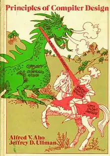 It is often called the "green dragon book"[1] and its cover depicts a knight and a dragon in battle; the dragon is green, and labeled "Complexity of Compiler Design", while the knight wields a lance and a shield labeled "LALR parser generator" and "Syntax Directed Translation" respectively, and rides a horse labeled "Data Flow Analysis". The book may be called the "green dragon book" to distinguish it from its successor, Aho, Sethi & Ullman's Compilers: Principles, Techniques, and Tools, which is the "red dragon book".[1] The second edition of Compilers: Principles, Techniques, and Tools added a fourth author, Monica S. Lam, and the dragon became purple; hence becoming the "purple dragon book". The book also contains the entire code for making a compiler. The back cover offers the original inspiration of the cover design: The dragon is replaced by windmills, and the knight is Don Quixote.
