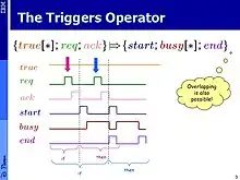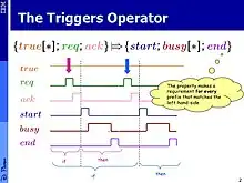 The most commonly used PSL operator is the "suffix-implication" operator (also known as the "triggers" operator), which is denoted by |=>. Its left operand is a PSL regular expression and its right operand is any PSL formula (be it in LTL style or regular expression style). The semantics of r |=> p is that on every time point i such that the sequence of time points up to i constitute a match to the regular expression r, the path from i+1 should satisfy the property p. This is exemplified in the figures on the right.