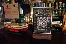 Restaurants can present a QR code near the front door or at the table allowing guests to view an online menu, or even redirect them to an online ordering website or app, allowing them to order and/or possibly pay for their meal without having to use a cashier or waiter. QR codes can also link to daily or weekly specials that are not printed on the standardized menus,[57] and enable the establishment to update the entire menu without needing to print copies. At table-serve restaurants, QR codes enable guests to order and pay for their meals without a waiter involved – the QR code contains the table number so servers know where to bring the food.[58] This application has grown especially since the need for social distancing during the 2020 COVID-19 pandemic prompted reduced contact between service staff and customers.[58]