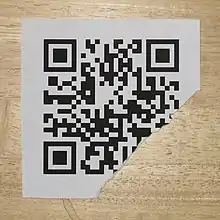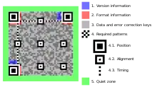 A QR code (quick-response code) is a type of two-dimensional matrix barcode, invented in 1994, by Japanese company Denso Wave for labelling automobile parts.[1][2] It features black squares on a white background with fiducial markers, readable by imaging devices like cameras, and processed using Reed–Solomon error correction until the image can be appropriately interpreted. The required data are then extracted from patterns that are present in both the horizontal and the vertical components of the QR image.[3]