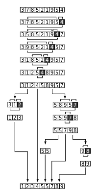 ![]() Animated visualization of the quicksort algorithm. The horizontal lines are pivot values. | |