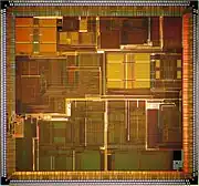 The R10000 consists of approximately 6.8 million transistors, of which approximately 4.4 million are contained in the primary caches.[2] The die measures 16.640 by 17.934 mm, for a die area of 298.422 mm2. It is fabricated in a 0.35 μm process and packaged in 599-pad ceramic land grid array (LGA). Before the R10000 was introduced, the Microprocessor Report, covering the 1994 Microprocessor Forum, reported that it was packaged in a 527-pin ceramic pin grid array (CPGA); and that vendors also investigated the possibility of using a 339-pin multi-chip module (MCM) containing the microprocessor die and 1 MB of cache.[3]