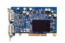 An Apple-branded Radeon 9600 Pro, with DVI and ADC ports. Some models of the Power Macintosh G4 and Power Macintosh G5 shipped with Radeon 9000-series cards built on distinctive blue PCBs.