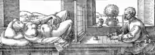 "Draughtsman Making a Perspective Drawing of a Reclining Woman" by Albrecht Dürer, possibly from 1532, shows a man using a grid layout to create an image. The German Renaissance artist is credited with first describing the technique.