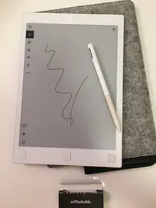 The reMarkable is an E Ink writing tablet for reading documents and textbooks, sketching and note-taking that attempts to fully replicate paper writing.[3] Developed by a Norwegian startup company of the same name, the device is geared towards students, academics and professionals.[4][5]
