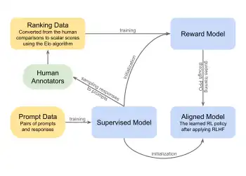 Human feedback is commonly collected by prompting humans to rank instances of the agent's behavior.[13][15][16] These rankings can then be used to score outputs, for example, using the Elo rating system, which is an algorithm for calculating the relative skill levels of players in a game based only on the outcome of each game.[3] While ranking outputs is the most widely adopted form of feedback, recent research has explored other forms, such as numerical feedback, natural language feedback, and prompting for direct edits to the model's output.[17]