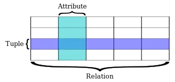 Attributes are commonly represented as columns, tuples as rows, and relations as tables. A table is specified as a list of column definitions, each of which specifies a unique column name and the type of the values that are permitted for that column. An attribute value is the entry in a specific column and row.