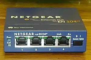 An Ethernet hub, active hub, network hub, repeater hub, multiport repeater, or simply hub[lower-alpha 1] is a network hardware device for connecting multiple Ethernet devices together and making them act as a single network segment. It has multiple input/output (I/O) ports, in which a signal introduced at the input of any port appears at the output of every port except the original incoming.[1] A hub works at the physical layer.[2] A repeater hub also participates in collision detection, forwarding a jam signal to all ports if it detects a collision. In addition to standard 8P8C ("RJ45") ports, some hubs may also come with a BNC or an Attachment Unit Interface (AUI) connector to allow connection to legacy 10BASE2 or 10BASE5 network segments.