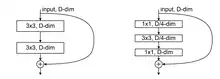 Two variants of convolutional Residual Blocks.[1] Left: a Basic Block that has two 3x3 convolutional layers. Right: a Bottleneck Block that has a 1x1 convolutional layer for dimension reduction (e.g., 1/4), a 3x3 convolutional layer, and another 1x1 convolutional layer for dimension restoration.