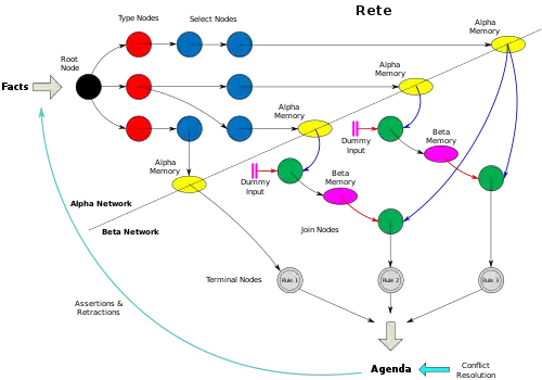 - The diagram provides a logical view of the Rete. Implementations may differ in physical detail. In particular, the diagram shows dummy inputs providing right activations at the head of beta node branches. Engines may implement other approaches, such as adapters that allow alpha memories to perform right activations directly.