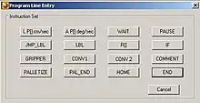The RoboLogix instruction set contains 16 commands, which are usually written as a program on a line-by-line basis. These commands are used to instruct the robot to perform tasks such as moving to a specific location, picking up an object, executing a subroutine, waiting, etc. One of the more popular commands in the instruction set is the IF instruction, which compares numerical values located in two registers. If a register has a value that is greater than (>), less than (<), greater than/equal to (>=), less than/equal to (<=), equal to (=), or not equal to (<>) another register, it will execute the next line in the program if the condition is true. The IF command is often used with the JMP LBL instruction to control program execution.