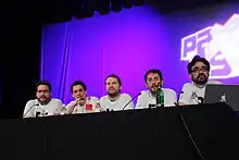 In 2006, Rooster Teeth partnered with Maybeck Productions to create PANICS, a short series filmed on F.E.A.R. that chronicles the misadventures of Bravo Team, a group of soldiers sent to investigate a paranormal disturbance.[81] The four publicly released episodes were released between September 27, 2005, and October 18, 2005,[83] and a prequel was released with F.E.A.R. – Director's Edition.[84] The mini-series won an award for Best Writing at the 2005 Machinima Film Festival.[82] Rooster Teeth's other machinima productions are 1-800-Magic, a four-episode mini-series created in 2006 using the game Shadowrun, and Supreme Surrender, a 2008 mini-series made using Supreme Commander. On February 13, 2017, Rooster Teeth premiered the teaser trailer for their upcoming animated series titled Sex Swing featuring members of their Funhaus division based on a recurring joke in their videos where they portray a fictional band of the same name.[85]
