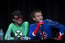 Rooster Teeth first ventured into live action in 2009 with Captain Dynamic, a mini-series to promote the online game City of Heroes.[91] The series tells the story of a team of writers hired to use the new in-game content creation tools to promote the title character, Captain Dynamic, the 'worst superhero in the world'. Directed by Matt Hullum and written by Burnie Burns, the series starred Ed Robertson of the Barenaked Ladies, who is a long time friend and fan of Rooster Teeth. A number of Rooster Teeth employees were present throughout the series, notably Joel Heyman as Captain Dynamic's primary writer. Actor Shannon McCormick appears as the series' antagonist, Great Face.[92] The series also led to the release of an iPhone app called the Awesome Button.[93]