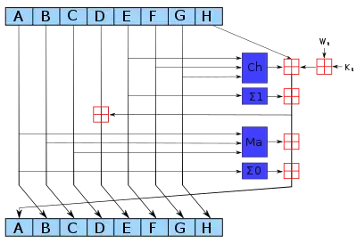 Note 1: All variables are 32 bit unsigned integers and addition is calculated modulo 232 Note 2: For each round, there is one round constant k[i] and one entry in the message schedule array w[i], 0 ≤ i ≤ 63 Note 3: The compression function uses 8 working variables, a through h Note 4: Big-endian convention is used when expressing the constants in this pseudocode, and when parsing message block data from bytes to words, for example, the first word of the input message "abc" after padding is 0x61626380 Initialize hash values: (first 32 bits of the fractional parts of the square roots of the first 8 primes 2..19): h0 := 0x6a09e667 h1 := 0xbb67ae85 h2 := 0x3c6ef372 h3 := 0xa54ff53a h4 := 0x510e527f h5 := 0x9b05688c h6 := 0x1f83d9ab h7 := 0x5be0cd19 Initialize array of round constants: (first 32 bits of the fractional parts of the cube roots of the first 64 primes 2..311): k[0..63] := 0x428a2f98, 0x71374491, 0xb5c0fbcf, 0xe9b5dba5, 0x3956c25b, 0x59f111f1, 0x923f82a4, 0xab1c5ed5, 0xd807aa98, 0x12835b01, 0x243185be, 0x550c7dc3, 0x72be5d74, 0x80deb1fe, 0x9bdc06a7, 0xc19bf174, 0xe49b69c1, 0xefbe4786, 0x0fc19dc6, 0x240ca1cc, 0x2de92c6f, 0x4a7484aa, 0x5cb0a9dc, 0x76f988da, 0x983e5152, 0xa831c66d, 0xb00327c8, 0xbf597fc7, 0xc6e00bf3, 0xd5a79147, 0x06ca6351, 0x14292967, 0x27b70a85, 0x2e1b2138, 0x4d2c6dfc, 0x53380d13, 0x650a7354, 0x766a0abb, 0x81c2c92e, 0x92722c85, 0xa2bfe8a1, 0xa81a664b, 0xc24b8b70, 0xc76c51a3, 0xd192e819, 0xd6990624, 0xf40e3585, 0x106aa070, 0x19a4c116, 0x1e376c08, 0x2748774c, 0x34b0bcb5, 0x391c0cb3, 0x4ed8aa4a, 0x5b9cca4f, 0x682e6ff3, 0x748f82ee, 0x78a5636f, 0x84c87814, 0x8cc70208, 0x90befffa, 0xa4506ceb, 0xbef9a3f7, 0xc67178f2 Pre-processing (Padding): begin with the original message of length L bits append a single '1' bit append K '0' bits, where K is the minimum number >= 0 such that (L + 1 + K + 64) is a multiple of 512 append L as a 64-bit big-endian integer, making the total post-processed length a multiple of 512 bits such that the bits in the message are: <original message of length L> 1 <K zeros> <L as 64 bit integer> , (the number of bits will be a multiple of 512) Process the message in successive 512-bit chunks: break message into 512-bit chunks for each chunk create a 64-entry message schedule array w[0..63] of 32-bit words (The initial values in w[0..63] don't matter, so many implementations zero them here) copy chunk into first 16 words w[0..15] of the message schedule array Extend the first 16 words into the remaining 48 words w[16..63] of the message schedule array: for i from 16 to 63 s0 := (w[i-15] rightrotate 7) xor (w[i-15] rightrotate 18) xor (w[i-15] rightshift 3) s1 := (w[i-2] rightrotate 17) xor (w[i-2] rightrotate 19) xor (w[i-2] rightshift 10) w[i] := w[i-16] + s0 + w[i-7] + s1 Initialize working variables to current hash value: a := h0 b := h1 c := h2 d := h3 e := h4 f := h5 g := h6 h := h7 Compression function main loop: for i from 0 to 63 S1 := (e rightrotate 6) xor (e rightrotate 11) xor (e rightrotate 25) ch := (e and f) xor ((not e) and g) temp1 := h + S1 + ch + k[i] + w[i] S0 := (a rightrotate 2) xor (a rightrotate 13) xor (a rightrotate 22) maj := (a and b) xor (a and c) xor (b and c) temp2 := S0 + maj h := g g := f f := e e := d + temp1 d := c c := b b := a a := temp1 + temp2 Add the compressed chunk to the current hash value: h0 := h0 + a h1 := h1 + b h2 := h2 + c h3 := h3 + d h4 := h4 + e h5 := h5 + f h6 := h6 + g h7 := h7 + h Produce the final hash value (big-endian): digest := hash := h0 append h1 append h2 append h3 append h4 append h5 append h6 append h7