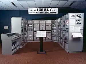 The name SIGSALY was not an acronym, but a cover name that resembled an acronym—the SIG part was common in Army Signal Corps names (e.g., SIGABA).[1] The prototype was called the "Green Hornet" after the radio show The Green Hornet, because it sounded like a buzzing hornet, resembling the show's theme tune, to anyone trying to eavesdrop on the conversation.[2]