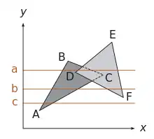 Scanline rendering (also scan line rendering and scan-line rendering) is an algorithm for visible surface determination, in 3D computer graphics, that works on a row-by-row basis rather than a polygon-by-polygon or pixel-by-pixel basis. All of the polygons to be rendered are first sorted by the top y coordinate at which they first appear, then each row or scan line of the image is computed using the intersection of a scanline with the polygons on the front of the sorted list, while the sorted list is updated to discard no-longer-visible polygons as the active scan line is advanced down the picture.