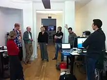 Each day during a sprint, the developers hold a daily scrum (often conducted standing up) with specific guidelines, and which may be facilitated by a scrum master.[3][26] Daily scrum meetings are intended to be less than 15 minutes in length, taking place at the same time and location daily. The purpose of the meeting is to announce progress made towards the sprint goal and issues that may be hindering the goal, without going into any detailed discussion. Once over, individual members can go into a 'breakout session' or an 'after party' for extended discussion and collaboration.[27] Scrum masters are responsible for ensuring that team members use daily scrums effectively, or, if team members are unable to use them, to provide alternatives to achieve similar outcomes.[28][29]