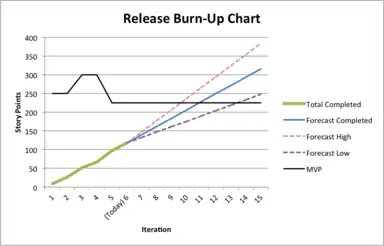 Updated at the end of each sprint, the release burn-up chart shows progress towards delivering a forecast scope. The horizontal axis of the release burn-up chart shows the sprints in a release, while the vertical axis shows the amount of work completed at the end of each sprint.